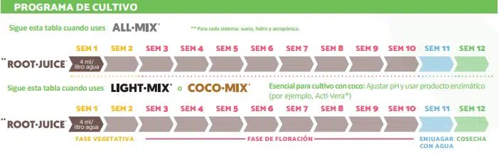 Root Juice debe mezclarse con agua durante las dos primeras semanas de crecimiento de la planta, debido a que es el momento en el cual la planta desarrolla mayor cantidad de raíces. Puede utilizarse durante toda la fase de crecimiento para conseguir maximizar el crecimiento de nuestras plantas.